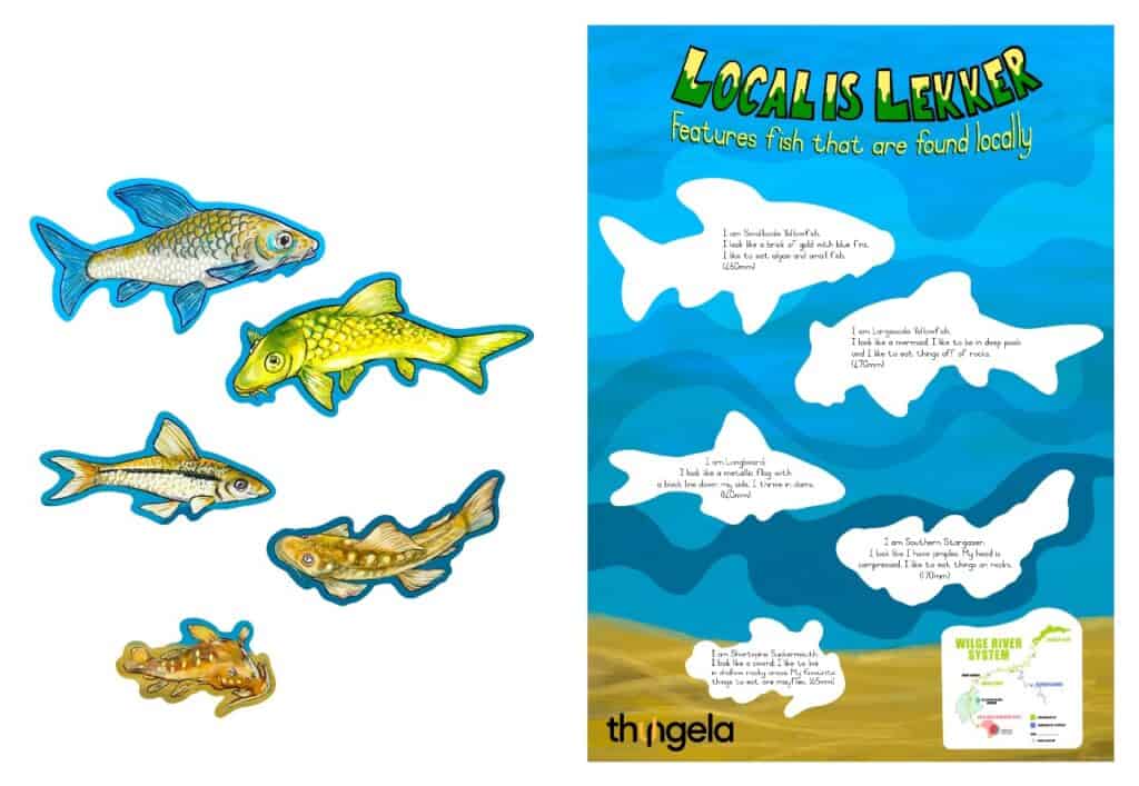 The second poster, Local is Lekker!, highlights fish found locally within the region, including the Southern stargrazer, Bushveld smallscale yellowfish, Shortspine suckermouth, Lowveld largescale yellowfish and Longbeart–all also categorized as LC.